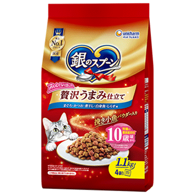 穀類(トウモロコシ、コーングルテンミール、小麦粉、パン粉)、肉類(ポークミール、ビーフミール、チキンミール、チキンエキス)、動物性油脂、魚介類(フィッシュエキス、フィッシュミール、煮干パウダー、かつお節、まぐろミール、かつおミール、白身魚ミール、乾燥シラス)、セルロースパウダー、酵母、野菜類(ビートパルプ)、酵母エキス、ミネラル類(カルシウム、塩素、コバルト、銅、鉄、ヨウ素、カリウム、マンガン、ナトリウム、リン、亜鉛)、調味料、ビタミン類(A、B1、B2、B6、B12、C、D、E、K、コリン、ナイアシン、パントテン酸、ビオチン、葉酸)、着色料(二酸化チタン、赤色102号、赤色106号、黄色4号、黄色5号)、アミノ酸類(タウリン)、酸化防止剤(ミックストコフェロール、ハーブエキス)