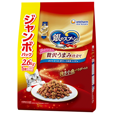 【まぐろ・かつお・煮干し・白身魚・しらす味】穀類(トウモロコシ、コーングルテンミール、小麦粉、パン粉)、肉類(チキンミール、ポークミール、ビーフミール、チキンエキス)、動物性油脂、魚介類(フィッシュミール、フィッシュエキス、煮干パウダー、かつお節、まぐろミール、かつおミール、白身魚ミール、乾燥シラス)、酵母、酵母エキス、ミネラル類(カルシウム、塩素、コバルト、銅、鉄、ヨウ素、カリウム、マンガン、ナトリウム、リン、亜鉛)、調味料、アミノ酸類(タウリン、メチオニン)、ビタミン類(A、B1、B2、B6、B12、C、D、E、K、コリン、ナイアシン、パントテン酸、ビオチン、葉酸)、着色料(二酸化チタン、赤色102号、赤色106号、黄色4号、黄色5号)、酸化防止剤(ミックストコフェロール、ハーブエキス)