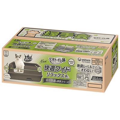 ※2.愛猫1頭(体重8kgまで)のデオトイレ使用時。ウンチをした場合は早く取り除いてください。普段の生活での消費者テストにて「トイレに近づいてもニオわない」と回答した消費者84.8%、外部機関におけるアンモニア濃度試験を実施、また、臭気判定士による臭気強度評価を実施。